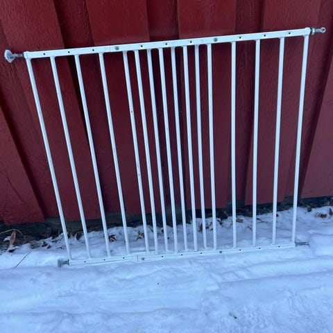 Pent brukt trappegrind gis bort mot henting. Den dekker en lysåpning på 83cm. Kan sages/tilpasses for mindre åpninger. Kan også fores på for evnt større åpninger om det trengs. Da må du på byggevaren for å kjøpe en trebit eller bruke noe du har
