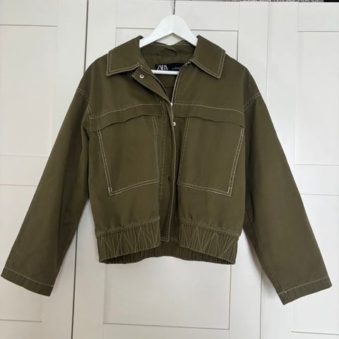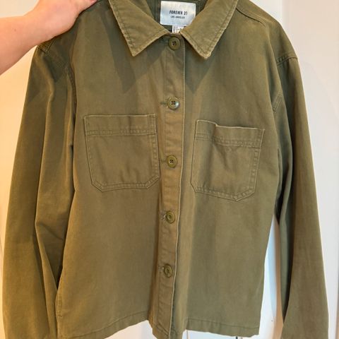 DAY Birger et Mikkelsen jakke for dame i størrelse 38 - M. Passer både XS til M. Jakken er grønn og laget av bomull. Modellen har kortere ermer, krage og knappelukking foran. Den har strikk i midjen for justerbar passform og flere lommer foran. Passer som lett ytterjakke i overgangssesonger eller som et lag over andre plagg. Veldig lite brukt. Ingen bruksmerker.