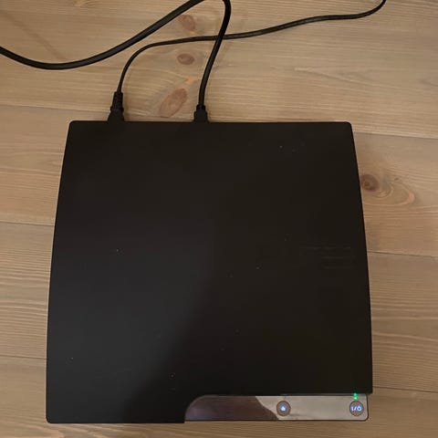 Sony Playstation 3 konsoll med to trådløse DualShock 3-kontrollere. Pakken inkluderer også strømkabel og USB-ladekabel til kontrollerne. Følgende spill på fysisk disk følger med: Call of Duty: Modern Warfare 2, Grand Theft Auto V og FIFA 08. Egnet for bruk med kompatibel TV eller skjerm med HDMI-tilkobling (HDMI-kabel ikke synlig på bildene). Konsollen er i sort utførelse.