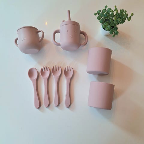 barne middagssett i melamin i rosa farge. Settet består av delt tallerken, kopp, gaffel og skje, tilpasset barn. Motiv med figurer og blomster. Egnet til servering av måltider for barn hjemme eller i barnehage. Laget i melamin som er lett og slitesterkt, og enkelt å rengjøre.
