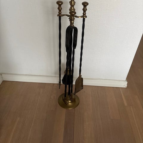 Peissettet består av stativ og tilbehør til bruk ved peis eller ovn. Utførelsen i messing gir et enkelt og funksjonelt uttrykk som passer i mange interiører. Settet er egnet til praktisk håndtering og oppbevaring av peisredskaper ved ildstedet.