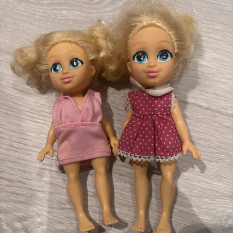 Barbie dukker sett med to små dukker med kjoler. Settet består av to mindre dukker, begge kledd i enkle kjoler – én i lilla og én i svart.