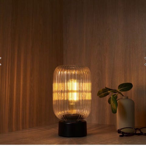 Rusta bordlampe i metall med svart, sylinderformet gitter-skjerm. Lampen har plass til én lyspære med synlig filament, som gir et dekorativt uttrykk. Passer som bordlampe på sidebord, hylle eller nattbord. Design ukjent (kan ikke finne denne lampen)