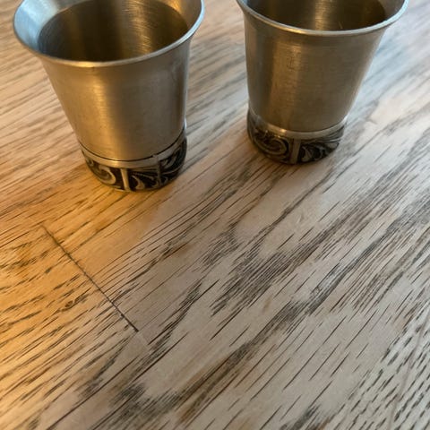 Hendig lite skinnetui med fire - 4- drikkebegre i gullforgylt sølv.