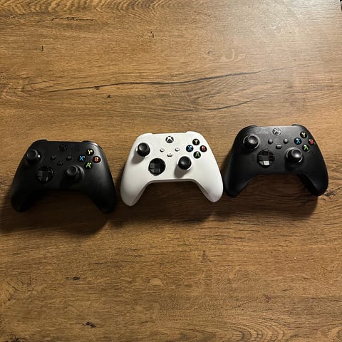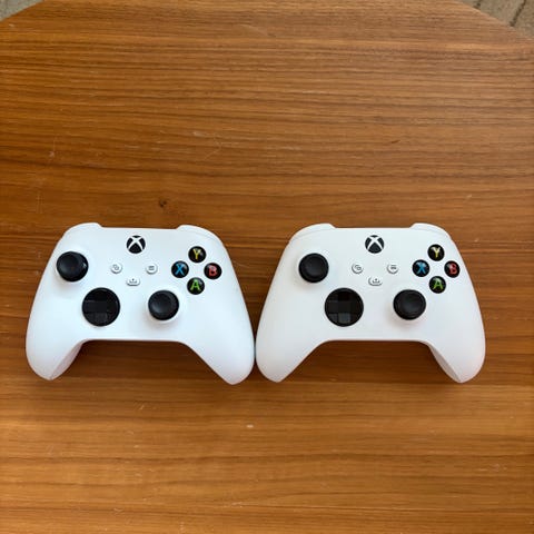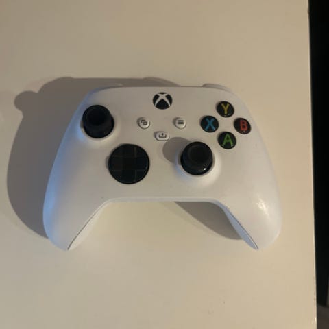 Xbox Series trådløse kontrollere i hvit farge. Standard Xbox-layout med to analoge styrespaker, styrekors, skulderknapper og ABXY-knapper. Passer til Xbox Series-konsoller og kan også brukes med kompatible enheter som støtter Xbox-kontrollere via trådløs tilkobling eller kabel, avhengig av oppsett. Egnet for ulike typer spill, både alene og i flerspiller.