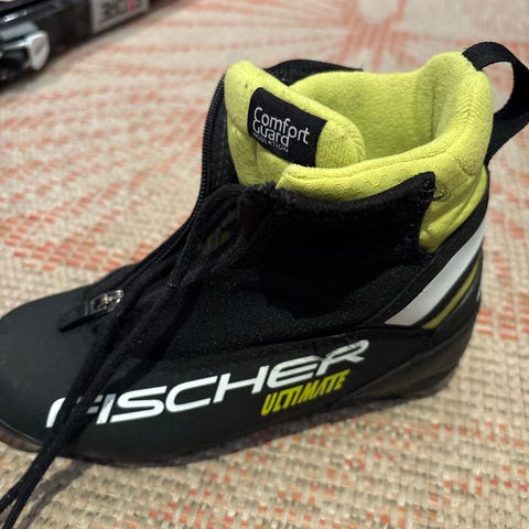 Fischer Ultimate langrennsstøvler i størrelse EU34. Overdel og såle i syntetisk materiale, fôr i tekstil. Fargekombinasjon svart og gul med refleksdetaljer bak. Støvlene er egnet til langrenn og passer til barn eller personer som bruker skostørrelse 34.