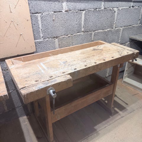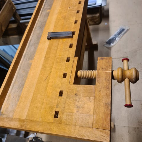 Benken har kraftig treplate med hull for benkehaker og solid understell i tre. Egnet som arbeidsbenk for snekkerarbeid, trearbeid eller hobbybruk i verksted, garasje eller bod.