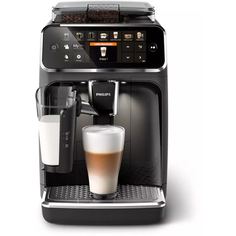 Sort philips kaffemaskin som lager god espresso med egen kvern og melkeskummer.