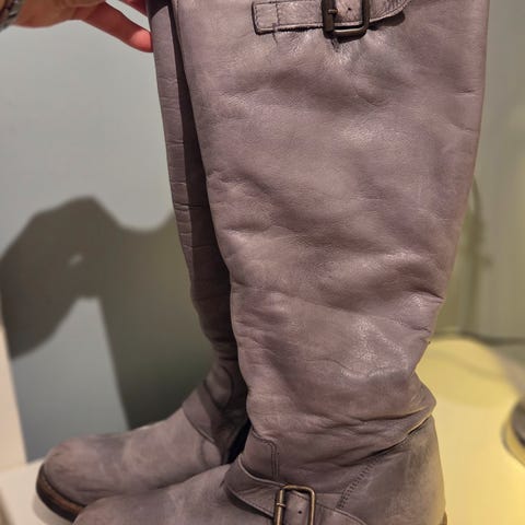 Bianco støvletter i størrelse 41. Høye, svarte støvler med lav hæl. Overdel i semsket materiale med elastisk felt øverst for bedre passform. såle med liten hæl. Passer til bruk i hverdagen og til penere antrekk i kjøligere vær.