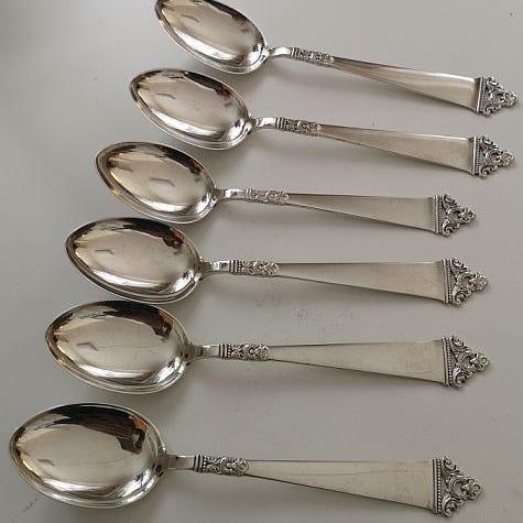 Settet består av 6 stk spiseskjeer - lengde 18 cm, alle i samme mønster og med tydelige 830 S-stempler.