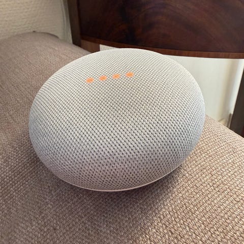Google smart-høyttaler i kompakt, rund design. Oversiden er trukket i grått tekstil, mens undersiden har oransje felt og hvit kant. Enheten kobles til strøm via medfølgende kabel. Høyttaleren kan brukes til avspilling av musikk, styring av kompatible smarthjem-enheter, stemmestyrte spørsmål og varsler, avhengig av tilkobling til Wi-Fi og kompatible tjenester.