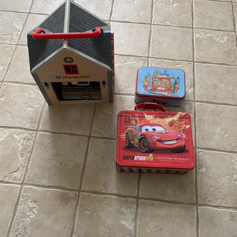 Lego og to Lego brett i kul kasse som ser ut som et hus 500,-