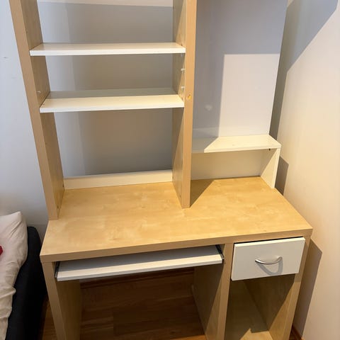 Skrivebord i svart med integrerte hyller. Bordet har stor arbeidsflate med utsparinger foran som kan brukes til kabelhåndtering eller koppholdere. Over arbeidsflaten er det to åpne hyllenivåer som gir ekstra oppbevaringsplass for bøker, permer eller utstyr. Konstruksjonen står på fire bein med sideplater som gir støtte. Egner seg som arbeidsplass til hjemmekontor, studierom eller gamingoppsett.