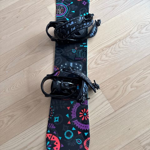 Bindingene er montert på brettet og har justerbare stropper og høyback for støtte og kontroll. Snowboardet leveres som sett med brett, bindinger og støvler slik det vises på bildene.