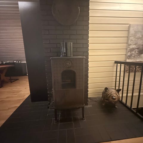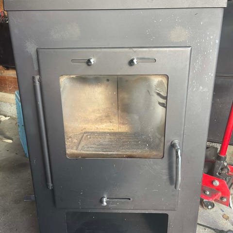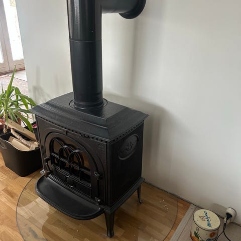 Frittstående vedovn i svart stål med glassdør i front. Usikker på modell da det ikke er noen synlige merker. Tror det er Jøtul. Ovnen har synlig røykrørstilkobling på toppen og luftregulering i front under døren. Den står på fire ben og har håndtak i tre på døren. Sprekk i stein og løs røykpakkning. Dette lar seg kjøpe løst som ekstra utstyr. Må hentes.