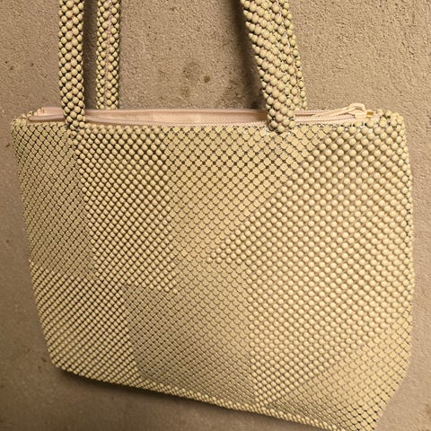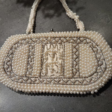 vintage perleveske, fra merket Grandee Bead, fra 1960-tallet med et hvitt faux-perledesign, gullfarget lås og en slank topphåndtak.