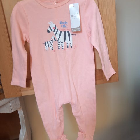 3 stk sparkebukser/pyjamas i myk bomull med føtter og klorevotter, str 50/62. Mange fine farger og mønstre. Kan brukes av både gutt og jente. Glidelås som kan åpnes og lukkes begge veier for enklere bleieskift. Kjøpt i England og er fra merket George. God kvalitet.