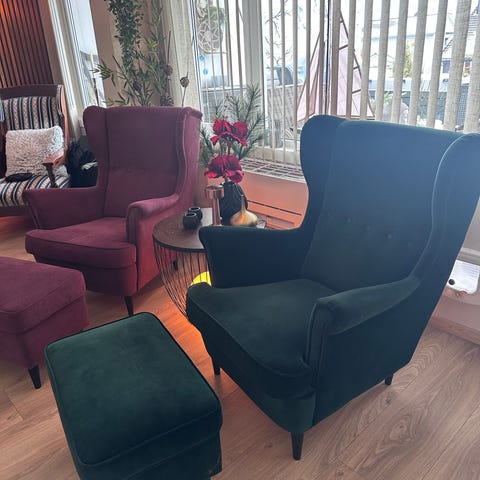 Pent brukt velurstol med puff. Selges grunnet plassmangel