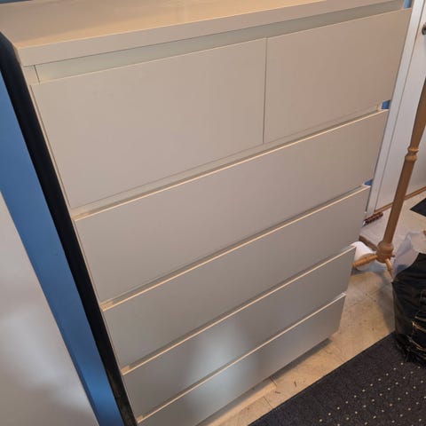 Kommoden er opprinnelig hvit, men malt i fargen sand (beige).