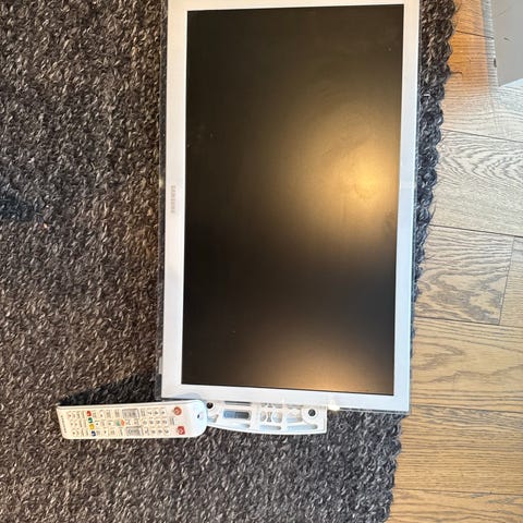 Samsung TV 47" flat skjerm. Veggmontert i bildene. Mulig vi finner foten også, men den henger på vegg nå. Veggfest følger med. Modellen fremstår som en moderne flatskjerm-TV egnet for vanlig TV-bruk og tilkobling av eksterne enheter via HDMI.