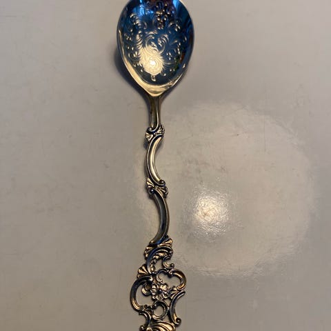 Opphøiet Rose kaffeskje, lengde ca. 11,5 cm.