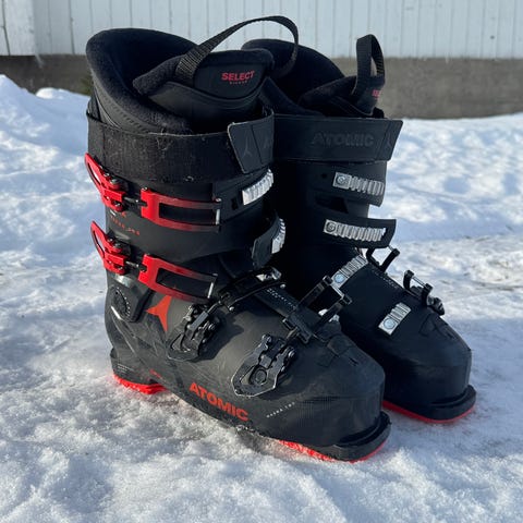 Atomic alpinstøvler i svart og oransje, med stivhet 110. Dvs. Ikke de aller stiveste, men god støtte. Støvlene har fire justerbare spenner per støvel og kraftig powerstrap øverst for god lukking rundt leggen. Modellen har justerbar bakdel med skruer for tilpasning av passform og fleks. Passer til vanlig alpinbinding. Ytterskall i hard plast med innersko som gir støtte og stabilitet under kjøring.