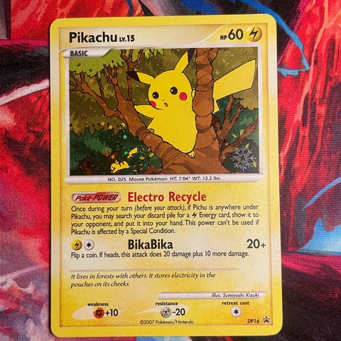 Selger et originalt Pokémon-kort: Pikachu 50 HP fra Expedition-settet (2002), kortnummer 124/165.