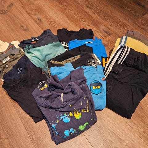 Består av pent og noen godt brukte klær. Flekker kan forekomme på noen plagg.