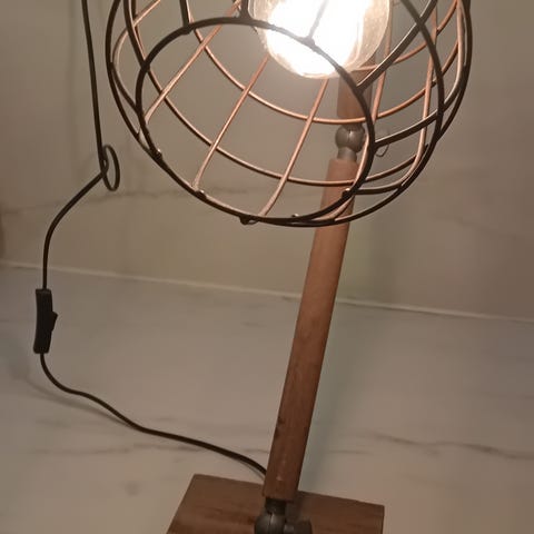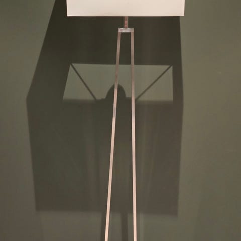 Gulvlampe på stativ med 3 justerbare bein i treverk. Justerbar lampeskjerm i metall med klaffer som kan åpnes og lukkes for å styre lyset. Egner seg som belysning i stue, kontor eller andre oppholdsrom hvor man ønsker retningsstyrt lys.