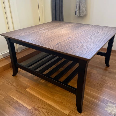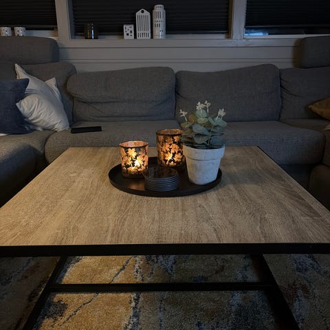 Salongbord i kvadratisk form med bordplate i lys brun treimitasjon. Bordet har en jevn overflate med synlig trestruktur. Understell og kanter ser ut til å være i mørk kontrastfarge, trolig metall eller malt treverk. Passer som stuebord foran sofa, med plass til lys, dekor og servering. Egnet til bruk i stue eller TV-stue.