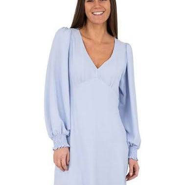 Kjolen har en flaterende passform, med puffdetalj i ermen og v-utringning. Kjolen er en omslagskjole.