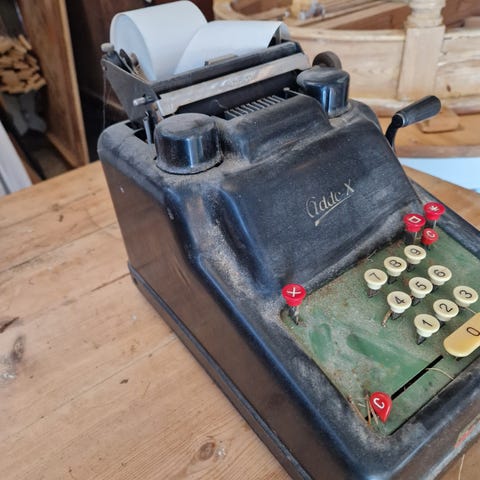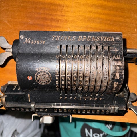 Eldre mekanisk regnemaskin selges. Klassisk modell med sveiv og tallhjul, trolig fra tidlig/ midten av 1900-tallet. Et dekorativt og nostalgisk stykke som passer fint som pynt på kontor, hytte eller i en samling.