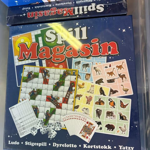 Vennerød Spillmagasin brettspill samling. Inneholder flere klassiske brettspill og familiespill samlet i én eske, blant annet stigespill, kortspill, yatzy, ludo og mikado. Esken inkluderer spillebrett, kort, terninger, pinner, brikker og andre nødvendige spillkomponenter. Egnet som familiespill og til spilling i grupper med barn og voksne.