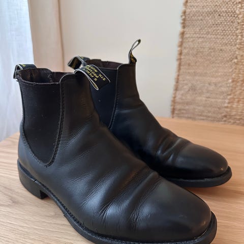R.M.Williams støvler i semsket skinn i størrelse 6 1/2 G. Se mål på bilde, hele skoa fra hæl til tupp er 28cm lang. Selges fordi de er litt for trange. Skal kjøpe disse i større størrelse, dette er skikkelig kvalitetssko.