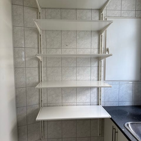 Hvite hyller og blanke hylleknekter. Pris pr hylle på IKEA er kr 269 pr stk.