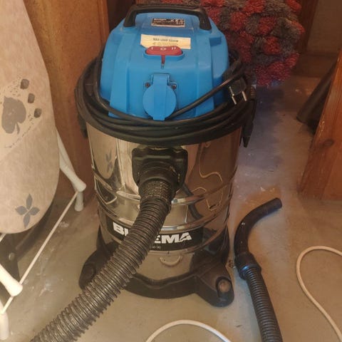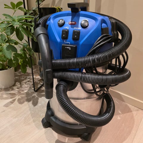 Blå og svart støvsuger med mye effekt, brukt som hybelstøvsuger men kan brukes som verkstedstøvsuger også.