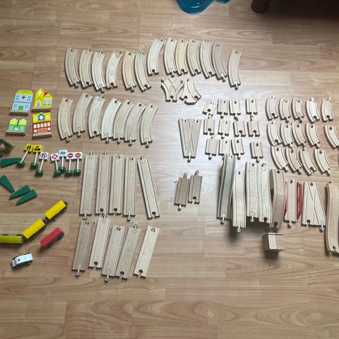 BRIO togbane i tre med et variert utvalg. Rette og buede skinner, broer osv. Sett med flere tog og vogner i ulike farger, samt småfigurer og elementer som trær og skilt. Togbanen er laget i treverk med enkelte plastdeler og passer for barn som liker å bygge og leke med tog og jernbane. Noen få skinner har tusj merker.