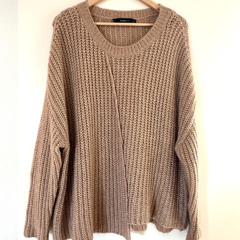 Genseren er beige og strikket i ullblanding, med ribbestruktur i stoffet.