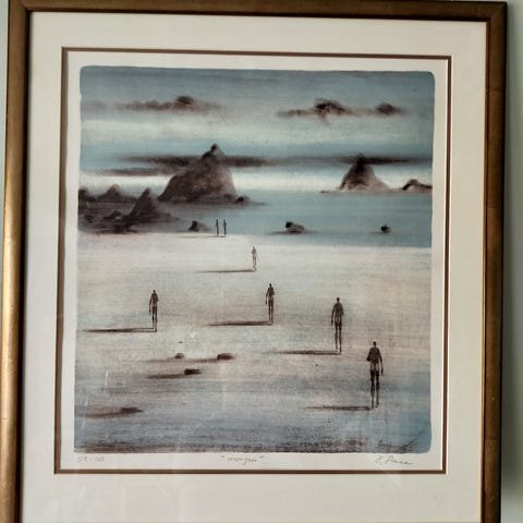 Bildet viser en figur som går på en brygge eller sti mot en statue og fjellformasjoner i bakgrunnen. Trykket er nummerert 33-300. Leveres innrammet med passepartout, som på bildet.