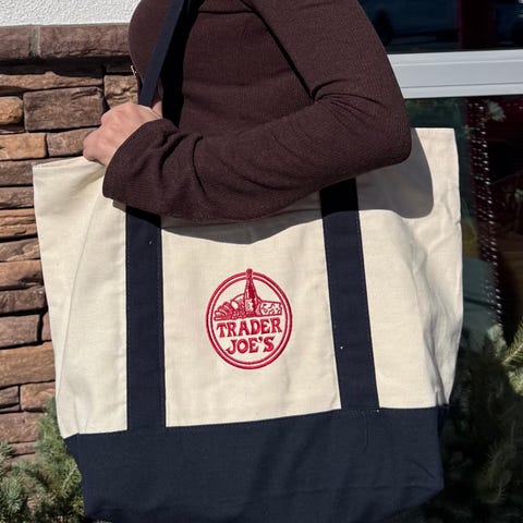 Handlenett fra Trader Joe's. Gjenbrukbar canvas tote bag i hvit og blå farge (se bilder).
