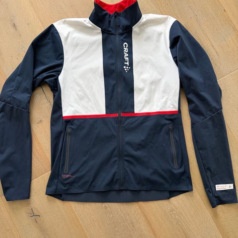 Craft treningssett for dame i størrelse S, bestående av jakke og bukse. Jakken har hel glidelås foran, høy krage og elastiske mansjetter. Den er hovedsakelig mørk blå med hvit frontpanel og røde felt i sidene. Størrelse small. Buksen er mørk blå med glidelåslommer foran og refleksdetaljer. Sett egnet til ulike typer trening og utendørsaktivitet. Størrelse cs.