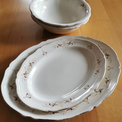 Har 7 suppeskåler,desse er litt slitt i gullet. Det eine suppeskåla er litt meir slitt enn dei andre. Selges samla for kr 600.-