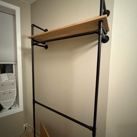 Garderobe, mørkt tre og sortlakkert metall. Ble kjøpt i 2023 for ca 2800 kr. Har vært lite i bruk. Må hentes!
