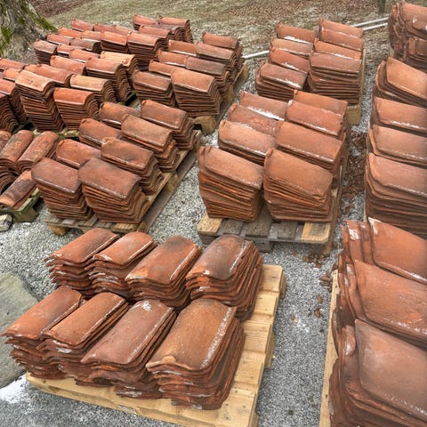 Tegltakstein i rød/oransje farge. Tradisjonell buet takstein i tegl, egnet til taktekking eller ulike bygge- og hageprosjekter. Flere stein i samme type og størrelse som vist på bildene.