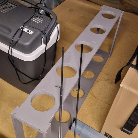 Veggfeste krok- og hullpanel i hvit plast. Består av to deler: én del med kroker og én del med runde hull. Kan brukes til oppheng av fiskestenger