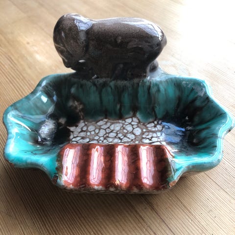 Dekorativ keramikkfigur utformet som en båt på et fat. Askebeger. Gjenstanden er i glasert keramikk med turkis bunnfarge og håndmalte detaljer i blant annet hvitt, gult, rosa, grønt og gull. Motivet inkluderer blomster og fugl på fatet samt dekorative linjer og mønstre på båten.