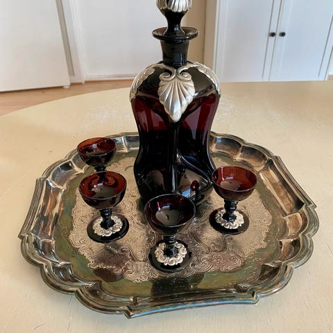 Håndmalt. Nydelig utførelse og i god stand fra 1960 - 70 tallet. Noe lakkslitasje under tre av koppene, men dette bekrefter at dette er tre og ikke resin. Størrelse lakkfat: 30 × 20 cm.