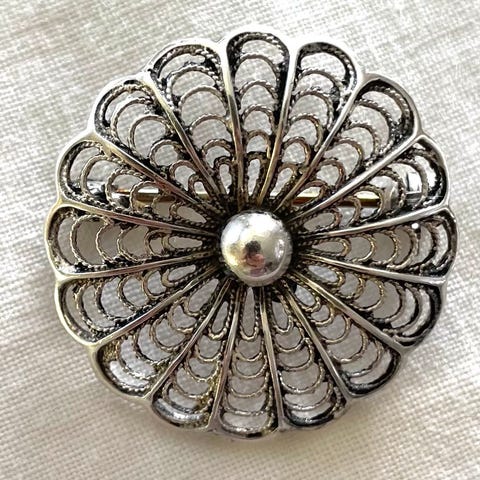 Sølv brosje i filigran 925 S med blomsterformet motiv. Brosjen har gjennombrutt mønster med buede kronblader og detaljert arbeid i front. Den festes med nål og lås på baksiden. Passer som pyntebrosje på jakke, genser, kjole eller sjal. Materiale: 925 sølv (stempel synlig på baksiden). Vekt 13,8 gram. Selges for kr 900,-