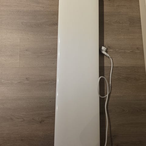 Hvit panelovn for innendørs bruk fra Mill. Elektrisk oppvarmingspanel som monteres på vegg eller kan plasseres langs gulvlist.