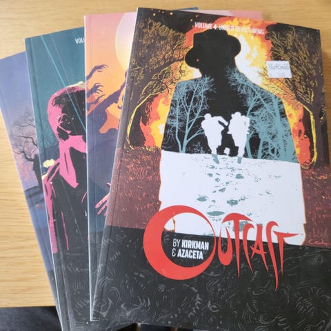Robert Kirkman Outcast bok i hardback-utgave. Tegneserie/graphic novel innen horror-sjangeren, skrevet av Robert Kirkman med illustrasjoner av Azaceta. Boken er på engelsk og egner seg for lesere som liker skrekk og grafiske romaner.